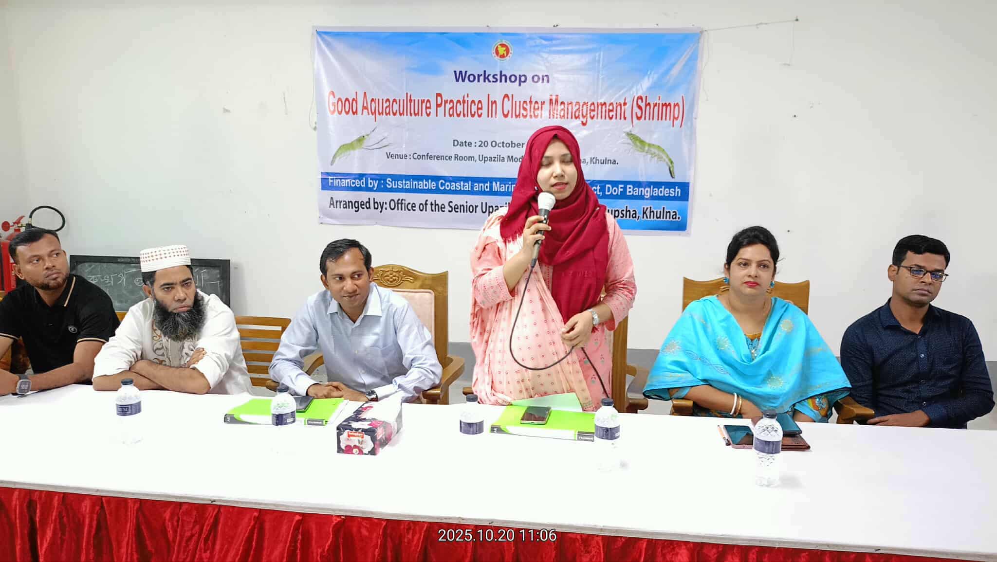 আঃ মান্নান (রূপসা প্রতিনিধি) : টেকসই উপকূলীয় ও সামুদ্রিক মৎস্য প্রকল্প, ডিওএফ বাংলাদেশ অর্থায়নে ক্লাস্টার ব্যবস্থাপনায় ভালো জলজ চাষ অনুশীলন (চিংড়ি) বিষয়ক কর্মশালা আজ ২০-শে অক্টোবর সকাল ১০টা থেকে