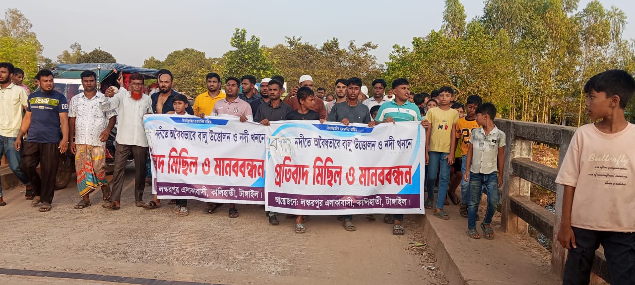 মোঃ আনিসুর রহমান শেলী প্রতিনিধি: বংশাই নদীতে সরকারি প্রকল্পের মাধ্যমে খনন কাজ বন্ধের দাবিতে টাঙ্গাইলের কালিহাতী উপজেলার নাগবাড়ী ইউনিয়নের লস্করপুর গ্রামবাসী মানববন্ধন ও প্রতিবাদ মিছিল করেছে। শনিবার (১৮ অক্টোবর) বিকেলে