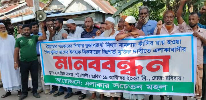 মোঃগোলাম রাব্বী,স্টাফ রিপোর্টার:- পটুয়াখালীর ইটবাড়িয়া ইউনিয়নের ৭ নং ওয়ার্ডের বাসিন্দা ইসহাক সিকদারের মুক্তি ও তার বিরুদ্ধে ফাঁসির রায় প্রত্যাহারের দাবিতে মানববন্ধন ও বিক্ষোভ মিছিল অনুষ্ঠিত হয়েছে। শনিবার (১৯ অক্টোবর)