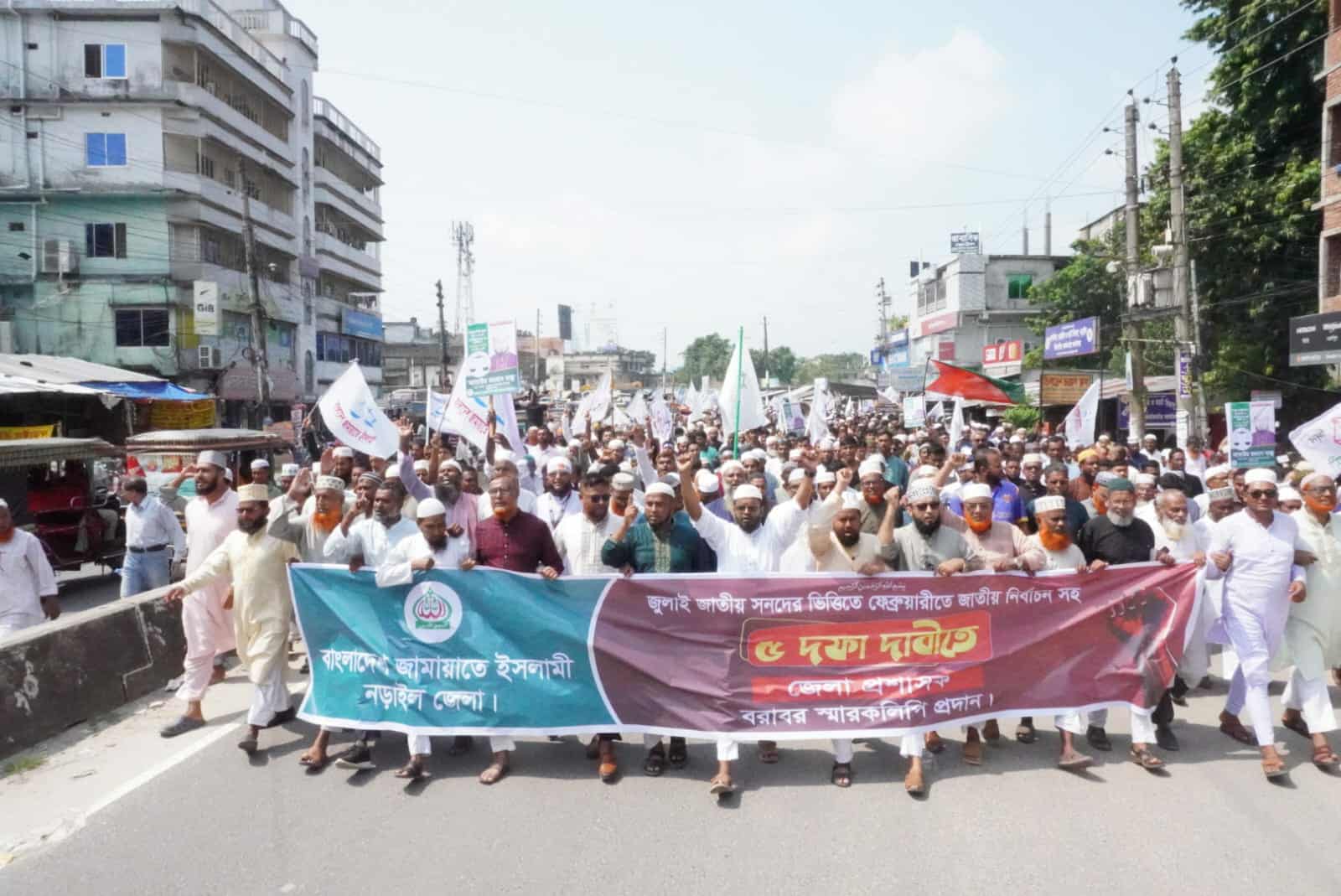 স্টাফ রিপোর্টার: জুলাই জাতীয় সনদের ভিত্তিতে আগামী ফেব্রুয়ারিতে নিরপেক্ষ ও অংশগ্রহণমূলক জাতীয় নির্বাচনের দাবিতে বিক্ষোভ সমাবেশ ও জেলা প্রশাসক বরাবর স্মারকলিপি দিয়েছে বাংলাদেশ জামায়াতে ইসলামী নড়াইল জেলা শাখা। রবিবার